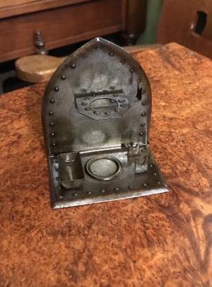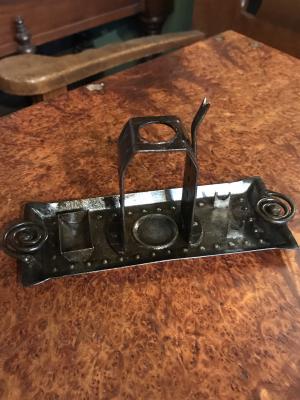 | Standard for a sealing wax set Arts & Crafts Germany; around 1900 Goberg (Hugo Berger) Signed wrought ironwrought iron H 11,5 cm Stamp, melting spoon and burner are missing € 50,- |