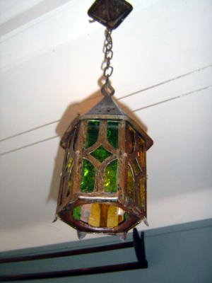 Lantern Arts & Crafts Germany; around 1910 Goberg (Hugo Berger) not signed wrought iron with yellow and green glass H 35 Ø 17 cm; H 68 cm with chain Sold |