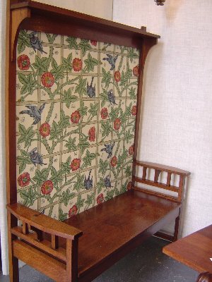 Halbank Arts & Crafts Engeland; circa 1910 ontwerper onbekend eiken met stof van William Morris dessin 'Trellis' H 177 B 139 D 53 cm € 750,- |