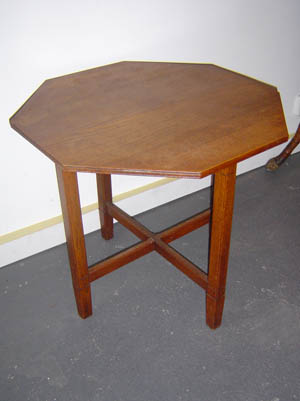 achtkantige tafel Nieuwe Kunst Nederland; circa 1910 ontwerper onbekend eiken H 63 Ø 74 cm € 150,- |