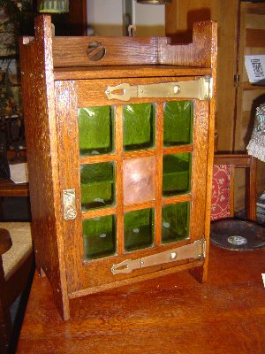 Hangkastje Arts & Crafts Nederland; circa 1905 ontwerper onbekend eiken met geelkoper beslag; groen bolgeblazen ruitjes H 59 B 35 D 25 cm € 175,- |