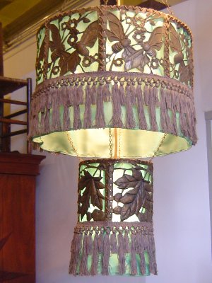 | Hanglamp Art Nouveau Frankrijk; circa 1900 ontwerper onbekend messing en stof H 100 ุ 40 cm details 725,- |