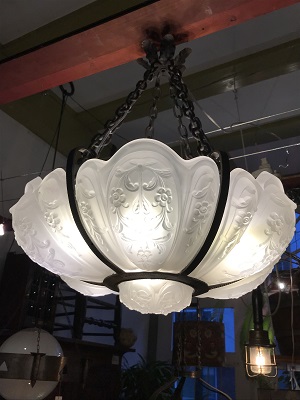 Hanglamp Art Deco Frankrijk; circa 1920 ontwerper onbekend smeedijzer met zware glazen stukken H 70 ุ 60 cm 600,- |